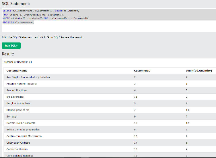 - CustomerID 별로 주문 수량을 세야 하는데 CustomerID는 Orders 테이블 에도 있으므로 굳이 Customer 테이블 까지는 조인할 필요가 없습니다만, 하신 것 처럼 CustomerName 별로 결과를 보여주려면 Customer 테이블까지 가져와서 쿼리를 작성하시면 됩니다.