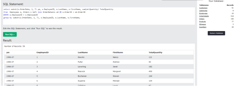 select substr(o.OrderDate, 1, 7) ym, o.EmployeeID, e.LastName, e.FirstName, sum(od.Quantity) TotalQuantity
