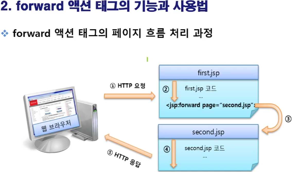 3. first.jsp를 실행하다가 forward 액션 태그를 만나면 지금까지 저장된 출력 버퍼의 내용을 삭제하고 프로그램 제어를 page 속성에서 설정한 second.jsp로 이동