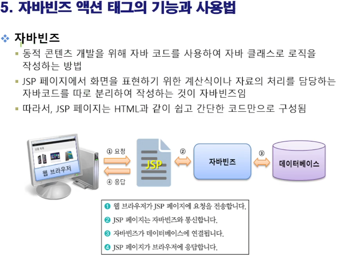 JSP 페이지에서 자바빈즈를 사용하기 위해 실제 자바 클래스를 선언하고 초기화하는 태그이다. id 속성과 scope 속성을 바탕으로 자바빈즈의 객체를 검색하고, 객체가 발견되지 않으면 빈 객체를 생성한다.