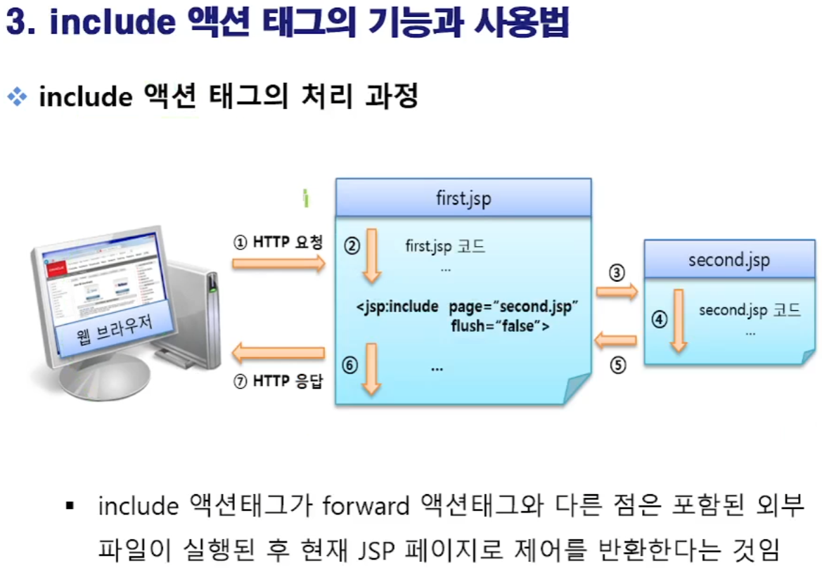 include 액션 태그는 forward 액션 태그처럼 외부 파일을 포함한다는 점이 비슷하지만 포함된 외부 파일이 실행된 후 현재 JSP 페이지로 제어를 반환한다는 것이 가장 큰 차이점이다. 또한 JSP 컨테이너는 현재 JSP 페이지에서 include 액션 태그를 만나면 include 액션 태그에 설정된 외부 파일의 실행 내용이 현재 JSP 페이지의 출력 버퍼에 추가 저장되어 출력된다.