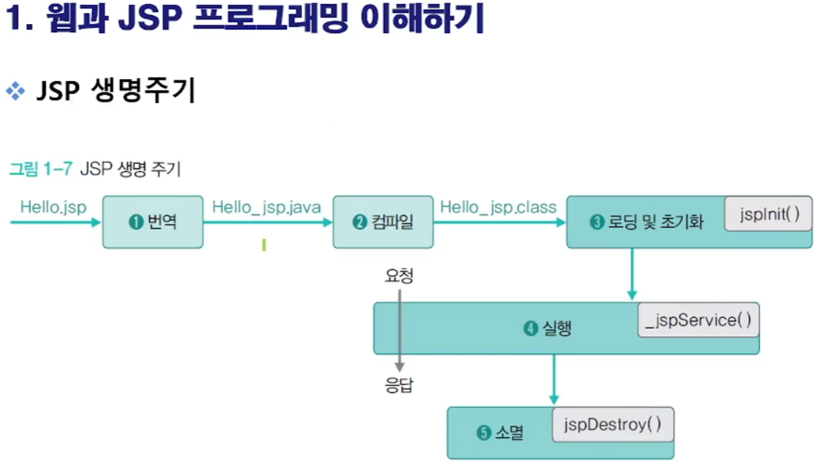 4. 실행(execution) 단계 - 각 client 요청에 대해 JSP 컨테이너가 요청 및 응답 객체를 전달하는 _jspService() 메소드를 실행한다. 이는 요청 후 로딩 및 초기화될 때마다 _jspService() 메소드를 호출하여 응답 객체를 전달한다. 이 단계는 JSP 생명 주기가 끝날 때까지 모든 client의 요청에 대해 상호 작용한다.