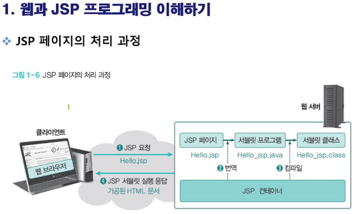 JSP 페이지는 하나의 서블릿 프로그램으로 변환되어 실행된다. 순서를 보자면 아래와 같다.