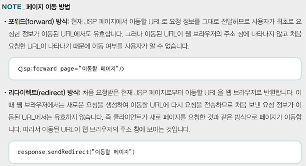 * 주의점 : 웹 서버는 forward 액션 태그를 수행할 때 출력 버퍼를 지우므로 현재 페이지에서 forward 액션 태그가 선언된 지점 이전까지 생성된 HTML 코드가 손실된다. 그러나 현재 페이지가 이미 전달 버퍼로 채워진 경우에는 전달이 중단될때까지 해당 내용을 웹 서버에 응답으로 보낸다. 이러면 잘못된 페이지가 클라이언트로 전송될 수 있다. 따라서 큰 출력을 생성하는 페이지에서 forward 액션 태그를 호출할 때는 신중해야 한다.